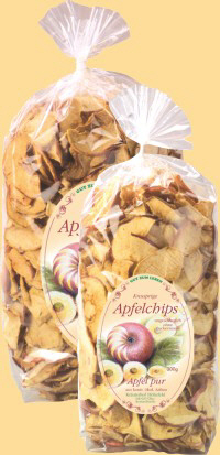 Die Äpfel werden in Handarbeit entkernt und dabei die Qualität jedes Apfels kontrolliert. Anschließend werden die Äpfel gewaschen und in Scheiben geschnitten. Auf einer modernen Bandtrocknungsanlage werden sie dann unverzüglich getrocknet. Während ca. 4 Stunden wird den Äpfeln durch Luft und Wärme die Feuchtigkeit entzogen. Der Fruchtzucker kristallisiert, dadurch schmecken die Chips herrlich süß. Jegliche Zusätze für Geschmack und Haltbarkeit sind überflüssig.