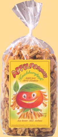 Wir sind die Apfelchips mit der besonderen Form: die Apfel-Pommes. Kinder mögen uns besonders gern.«